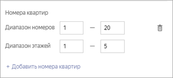 Номера квартир заполняются путем задания квартирных диапазонов. Квартирный диапазон позволяет задать информацию о номерах квартир, идущих подряд, расположенных на нескольких этажах, введя всего 4 значения: начальной и конечной квартир и начального и конечного этажей.