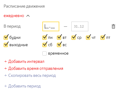 - Изменился порядок полей — на первом месте теперь даты действия расписания и дни курсирования, а после них задаются расписания в виде интервалов и отправлений, действующих в эти даты.