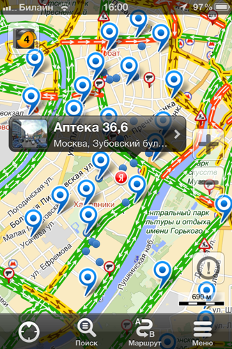 Первое изменение бросается в глаза сразу – это дизайн. Мы стараемся делать дизайн не просто для красоты, а решать с помощью него важные задачи. Так, при отображении результатов поиска мы расширили область карты – так удобнее просматривать результаты. И еще пример – теперь возможен одновременный просмотр результатов поиска и пробок. Это пригодится вам, например, если вы ищете аптеку, находясь в автомобиле.