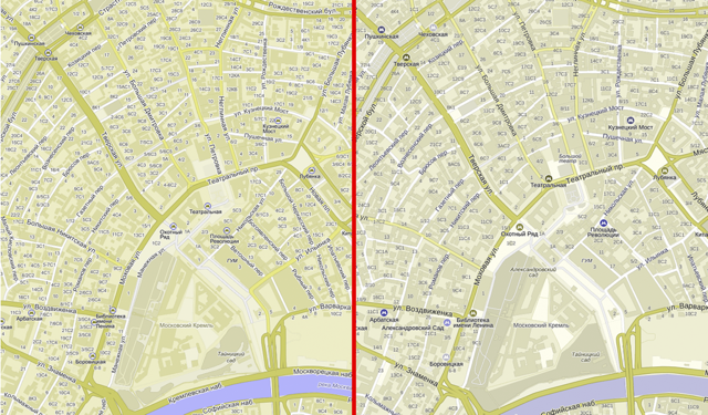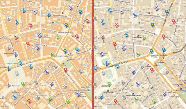 Но пользователю очень сложно различить между собой семь видов отображения — разница между соседними слишком мала для него. Поэтому, чтобы сделать карту удобнее, мы из семи стилей делаем три.