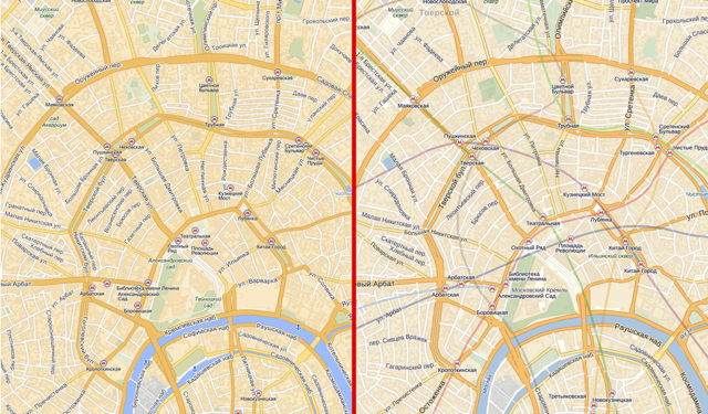 Когда-то у нас были отображены линии метро, а потом в одной из версий мы подумали разгрузить картинку, выключив их. Пользователям это не понравилось и они незамедлительно дали нам об этом знать через обратную связь. Мы сделали линии плавными и вернули их на карту — это важная ориентирующая информация.