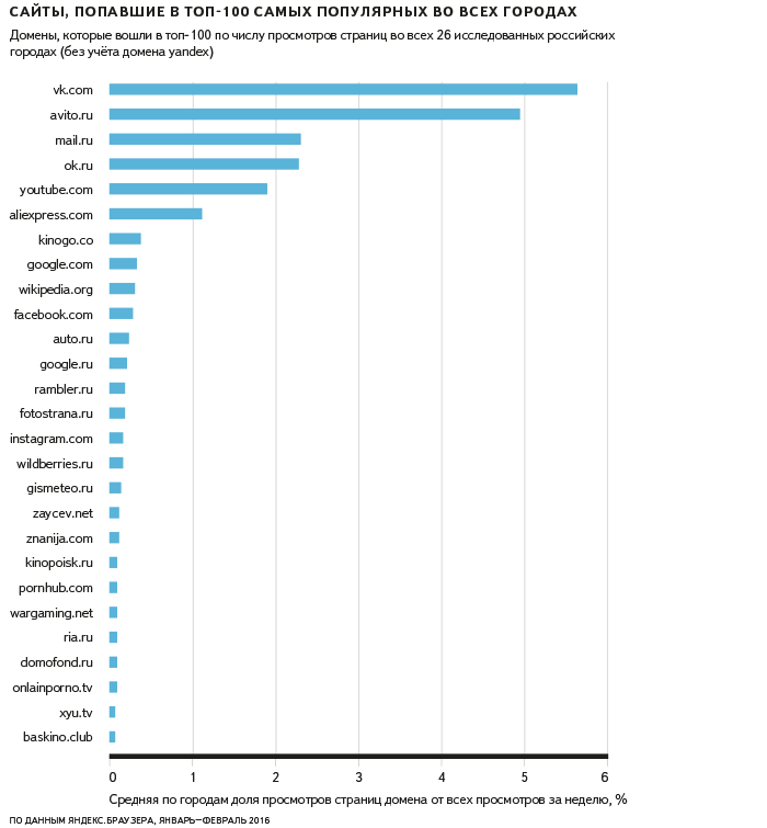 Среди них можно выделить список , страницы которых часто посещают пользователи из всех исследованных городов. В топ-100 самых посещаемых доменов во всех городах попали 28 доменов. Это те сервисы, которые востребованы пользователями рунета вне зависимости от географии. В среднем на эти сайты приходится треть просмотров страниц из каждого города.