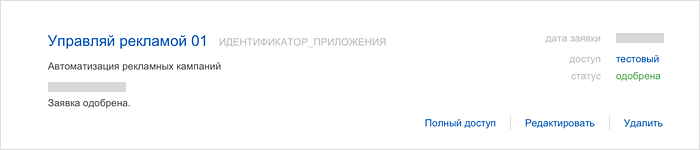 - Полный — полный доступ к API Директа, позволяет приложению и работать с тестовой средой, и управлять реальными кампаниями.