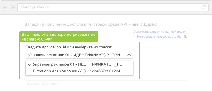 После регистрации приложения на Яндекс OAuth нужно подать заявку на доступ к API Директа. Наличие одобренной заявки обязательно для выполнения запросов к API. Получив заявку, мы добавим ваше приложение в реестр приложений, работающих с Директом, и сможем обращаться к вам как к его разработчику, например, для оповещения о важных новостях или для внесения корректировок в работу приложения.