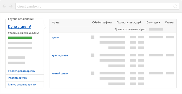 Кампания по продвижению в Директе состоит из групп объявлений, каждая из которых содержит объявления и ключевые фразы. Объявления могут включать в себя дополнительные элементы: изображения, быстрые ссылки и другие.