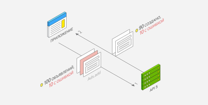 Все методы, изменяющие данные, — например, методы add, update, delete — принимают на вход массив объектов. Каждый объект в запросе обрабатывается отдельно. Например, если приложение отправило запрос на создание 100 объявлений и в 10 из них возникла ошибка, то остальные 90 объявлений будут успешно созданы. Сервер API вернет идентификаторы для 90 созданных объявлений и ошибки для остальных 10.
