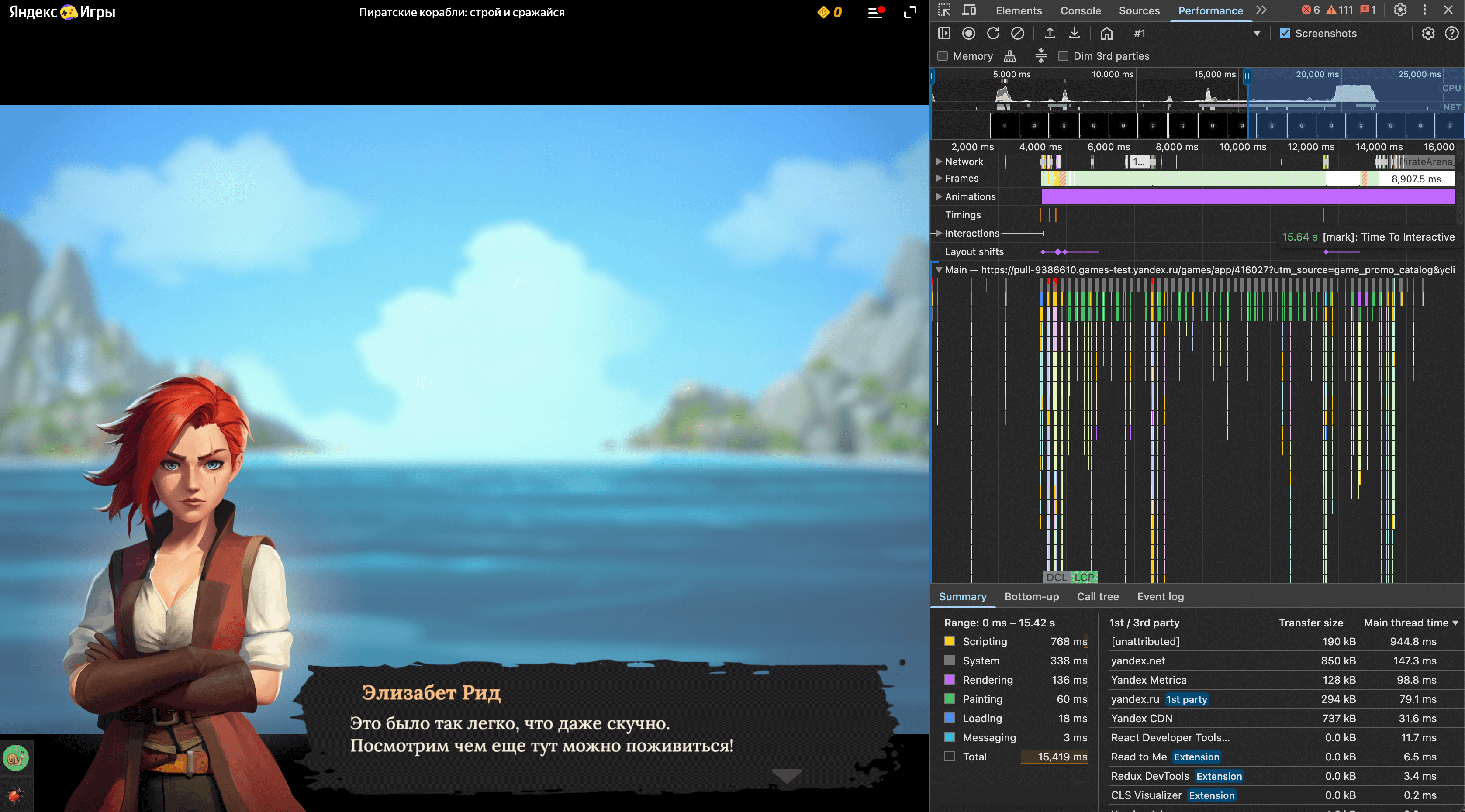 Платформа Яндекс Игры дает возможность отслеживать технические метрикиGame Ready и Time To Interactive (TTI) во вкладке Performance в DevTools. Вы можете посмотреть, в какой момент срабатывают метрики, какие задачи выполняются перед ними, и на основе этой информации оптимизировать и ускорить процессы.