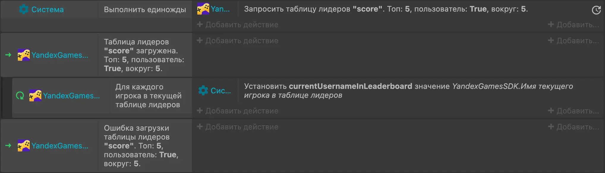 Чтобы начать работать с таблицей лидеров, используйте действие Запросить таблицу лидеров в связке с триггерными условиями При успешной загрузке таблицы лидеров и При ошибке загрузки таблицы лидеров. Действие и условия принимают следующие параметры: