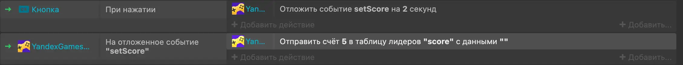 Например, если вы слишком часто обновляете счет в лидерборде, то вам стоит использовать особое условие На отложенное событие в связке с триггерным условием Отложить выполнение. Эта связка работает по аналогии с нативной связкой Сигнал → При получении сигнала, но откладывает вызов на определенное время с момента последней попытки выполнения.