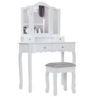 Белый туалетный столик для макияжа с табуретом и 5 ящиками зеркалом деревянный