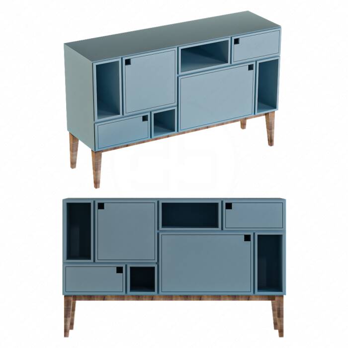 a blue cabinet with four compartments and two legs on the bottom, in front of a white background