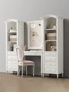 a white desk and chair in front of a wall mounted cabinet with drawers, mirror and shelves