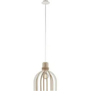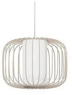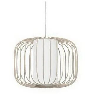 the copper and white light fixture is hanging from a metal wire frame, with an oval shaped