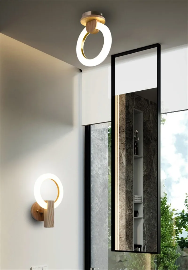 Современная Деревянная лампа с круглым кольцом, светодиодный потолочный светильник в скандинавском стиле, креативное бра теплого белого света для коридора, балкона, ресторана, спальни