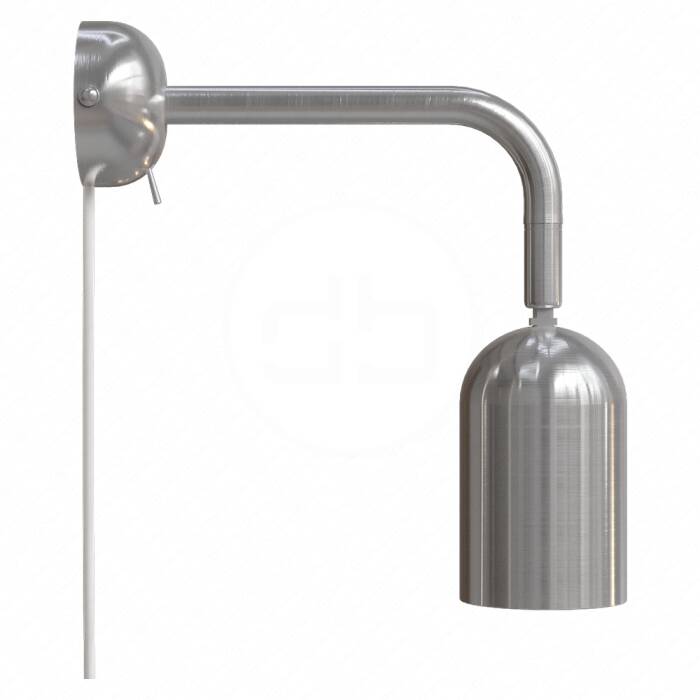 a wall mounted light with a white cord attached to the arm and an open bulb