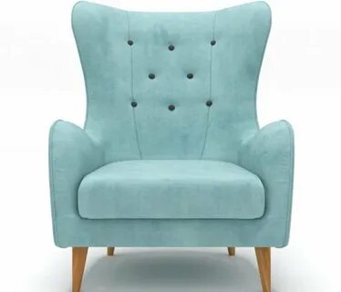 an upholstered chair with wooden legs and buttons on the armrests is shown