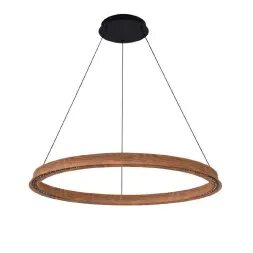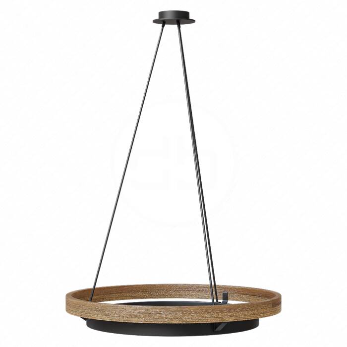 a circular light fixture with two lights hanging from it's center, and an oval wooden