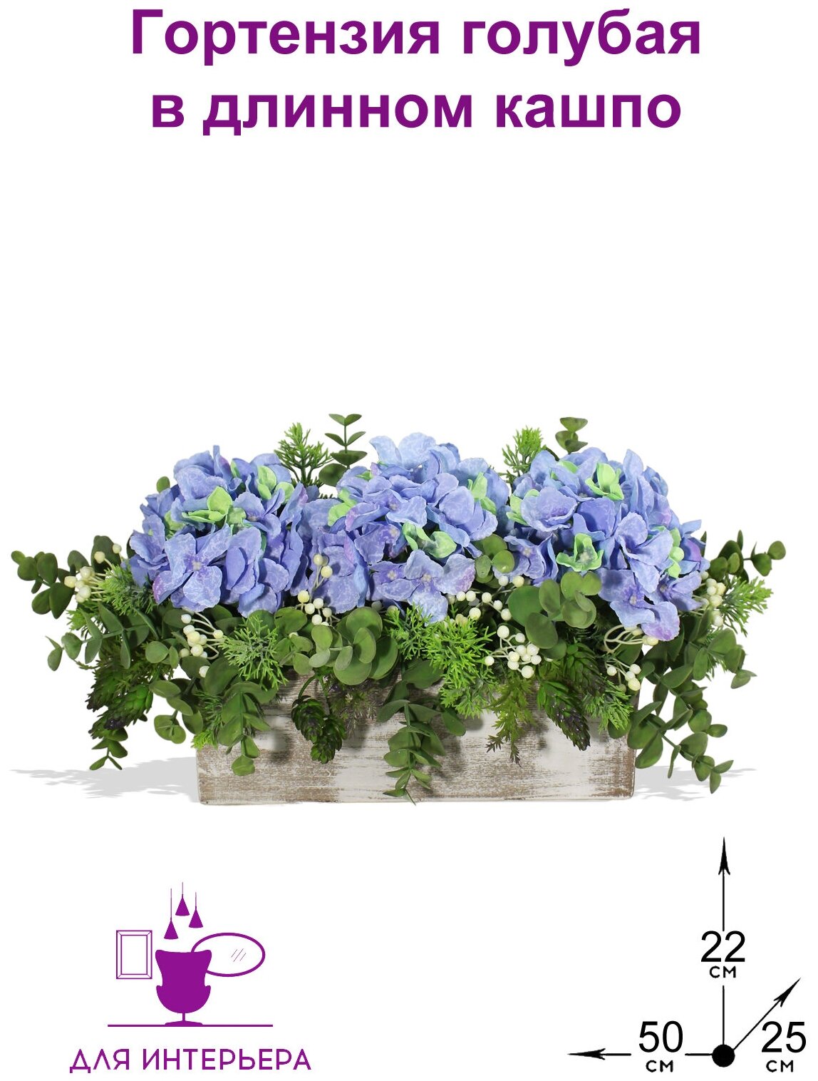 Композиция из искусственных цветов Гортензия голубая в длинном кашпо 22см: характеристики, фото, магазины поблизости на карте.