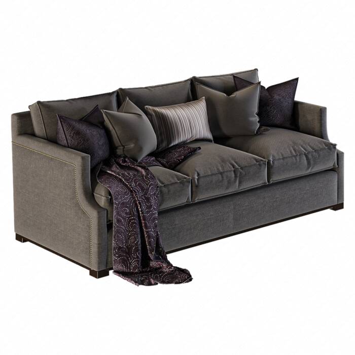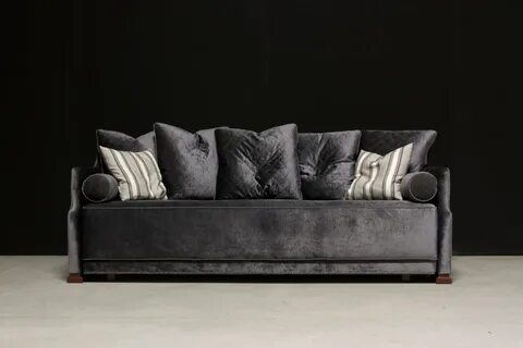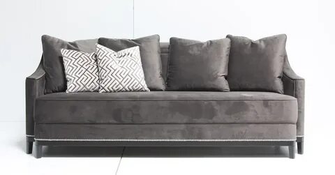 a gray couch with blue and white pillows on it's back end, sitting in front of a grey background