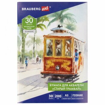 Бумага для акварели большая А3, 30 л., "старый трамвай", среднее зерно, 200 г/м2, бумага гознак, BRAUBERG ART CLASSIC, 112324