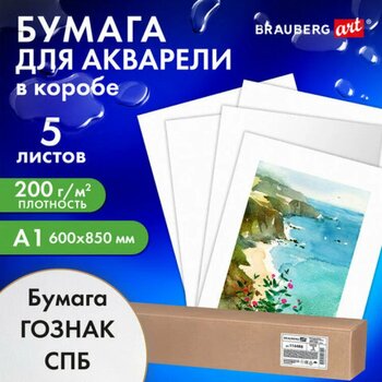 Бумага для акварели А1 (600х850 мм), комплект 5 листов, среднее зерно, 200 г/м2, гознак, BRAUBERG ART CLASSIC, 114488