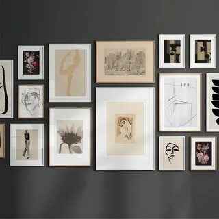 a bunch of pictures are hanging on the wall with white frames and black and white artwork