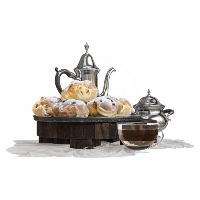 Homemade traditional algeria baklava with almond on stand cake for ramadan and drinking arabic tea, tea bowl and silver teapot, gl