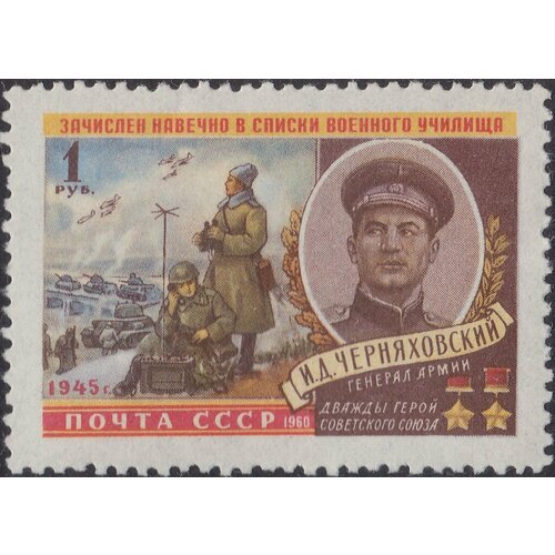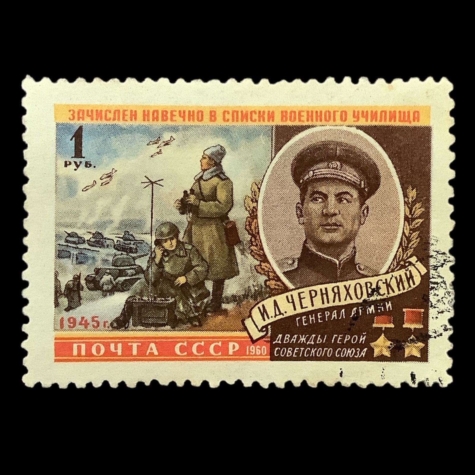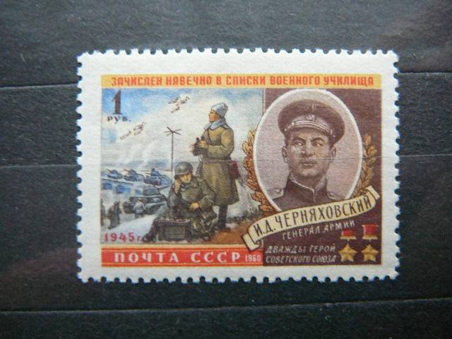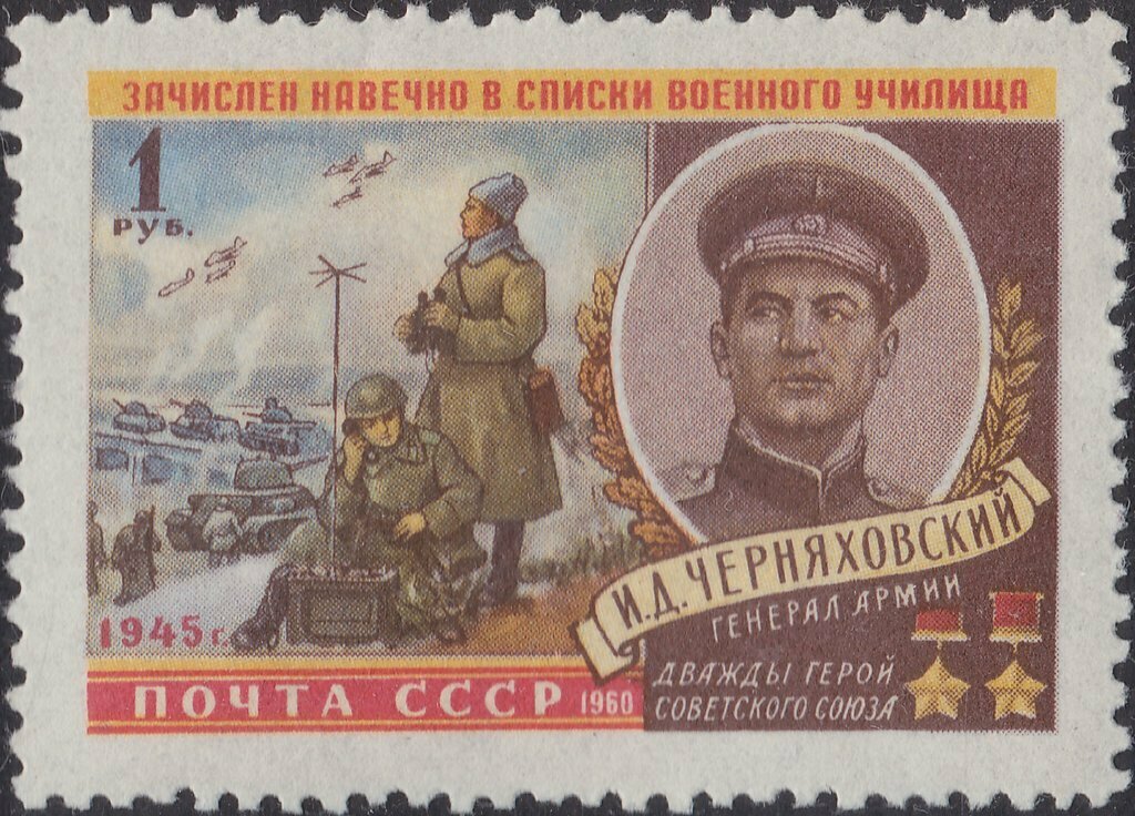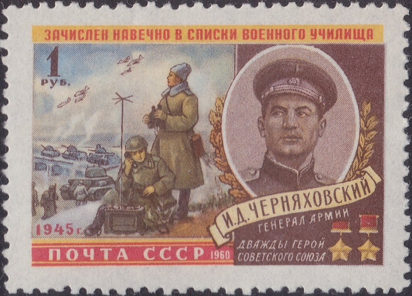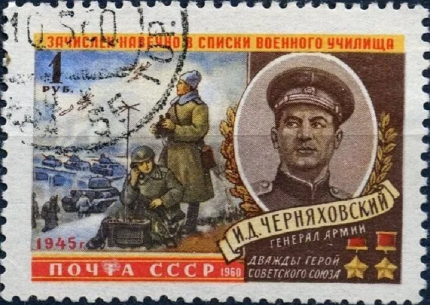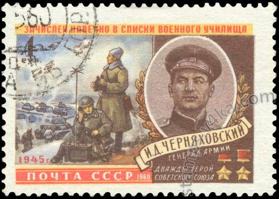 Марка "И.Д.Черняховский генерал армии. Дважды герой советского союза. Зачислен навечно в списки военного училища". СССР 1960 год