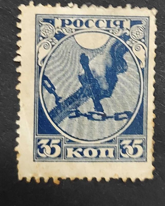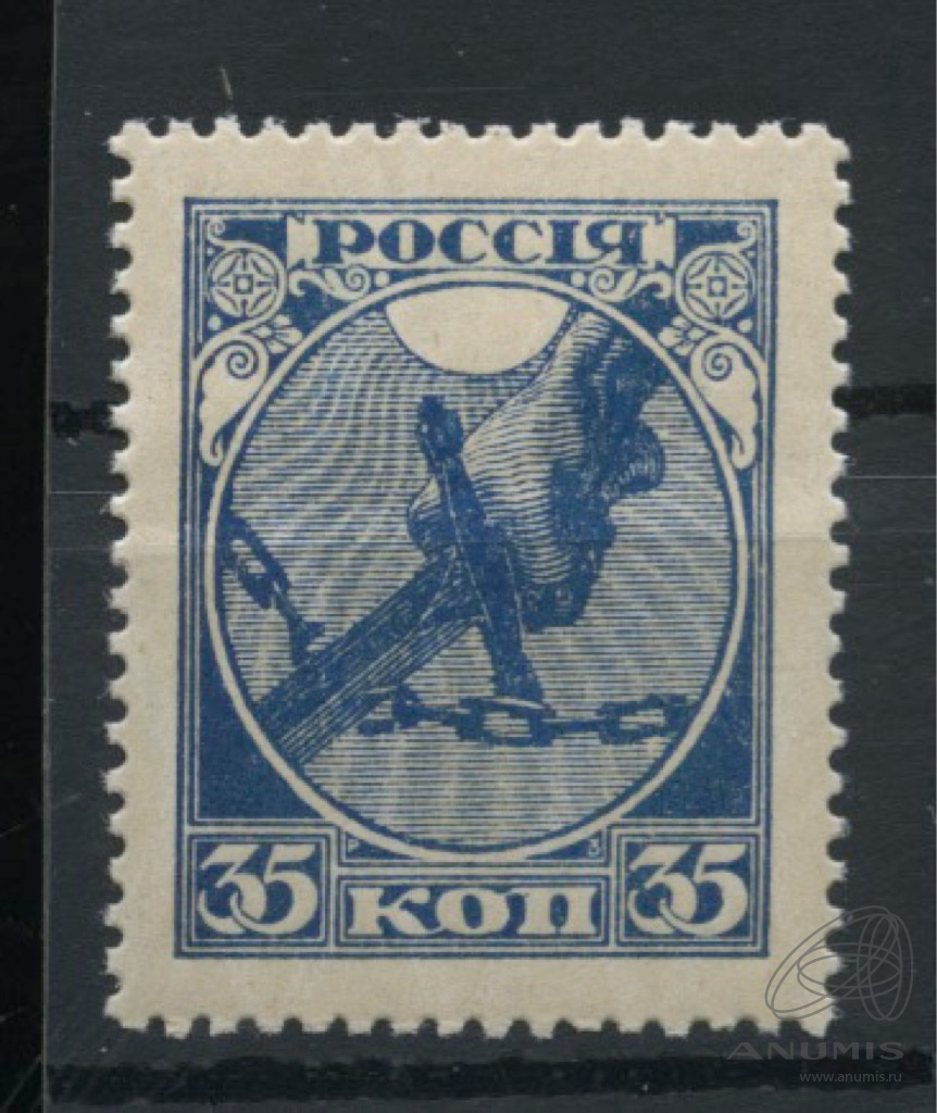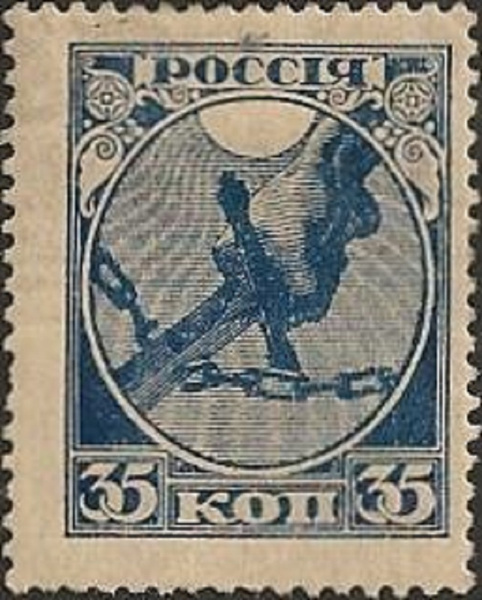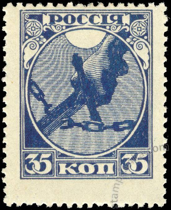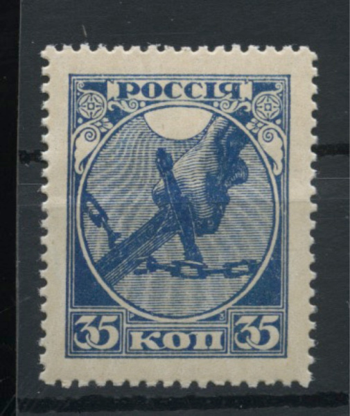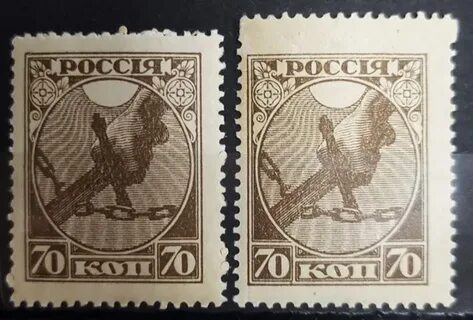 РСФСР 1918 год. Первый выпуск. Рука с мечом, разрубающая цепь. Разновидность - сдвиг изображения, правая марка на 2 мм больше