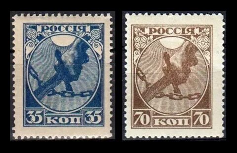 РСФСР 1918 г. № 01-02. Рука с мечом, разрубающим цепь. Серия из 2 марок. MNH(**)