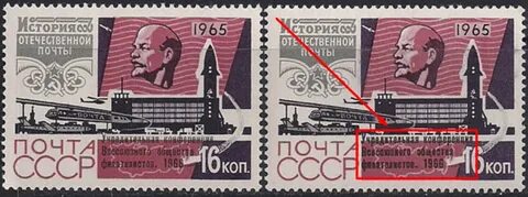 СССР 1966 год. Учредительная конференция Всесоюзного общества филателистов. Надпечатка на марке "История отечественной почты" (ном. 16к). Разновидность - жирный текст в надпечатке