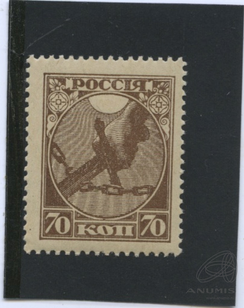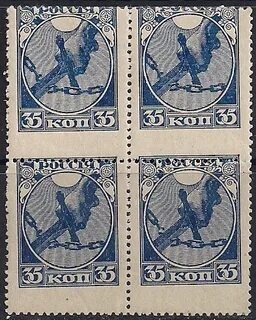 РСФСР 1918 год. Первый выпуск. Рука с мечом, разрубающая цепь. Квартблок. Разновидность - сдвиг изображения