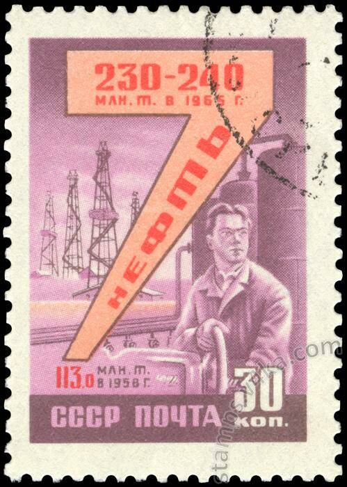 Марка почтовая. 1959 год, СССР. 30 копеек. Семилетний план. Нефть. Цена 40 руб.