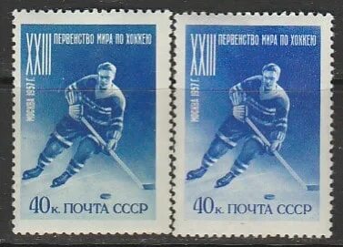СССР 1957 год. Хоккеист. Разновидность - разный оттенок синего, 2 марки.