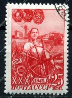 СССР 1948 г. • Сол# 1323 • 30-летие влксм • 25 коп. • Комсомолка - колхозница • Used(ФГ) VF - XF (Product code (SKU): S-USSR-1323-CTONH)