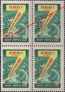Разновидность. СССР 1959 год, Семилетний План, Машиностроение, 100% Соеденены "0" и Черта, 1-я марка, квартблок