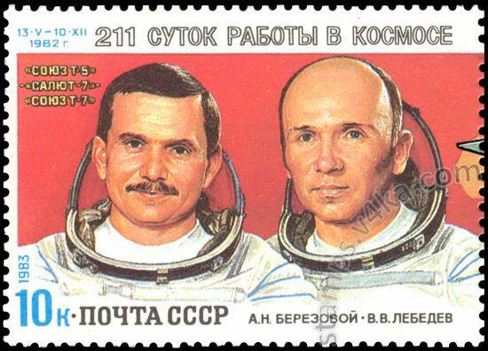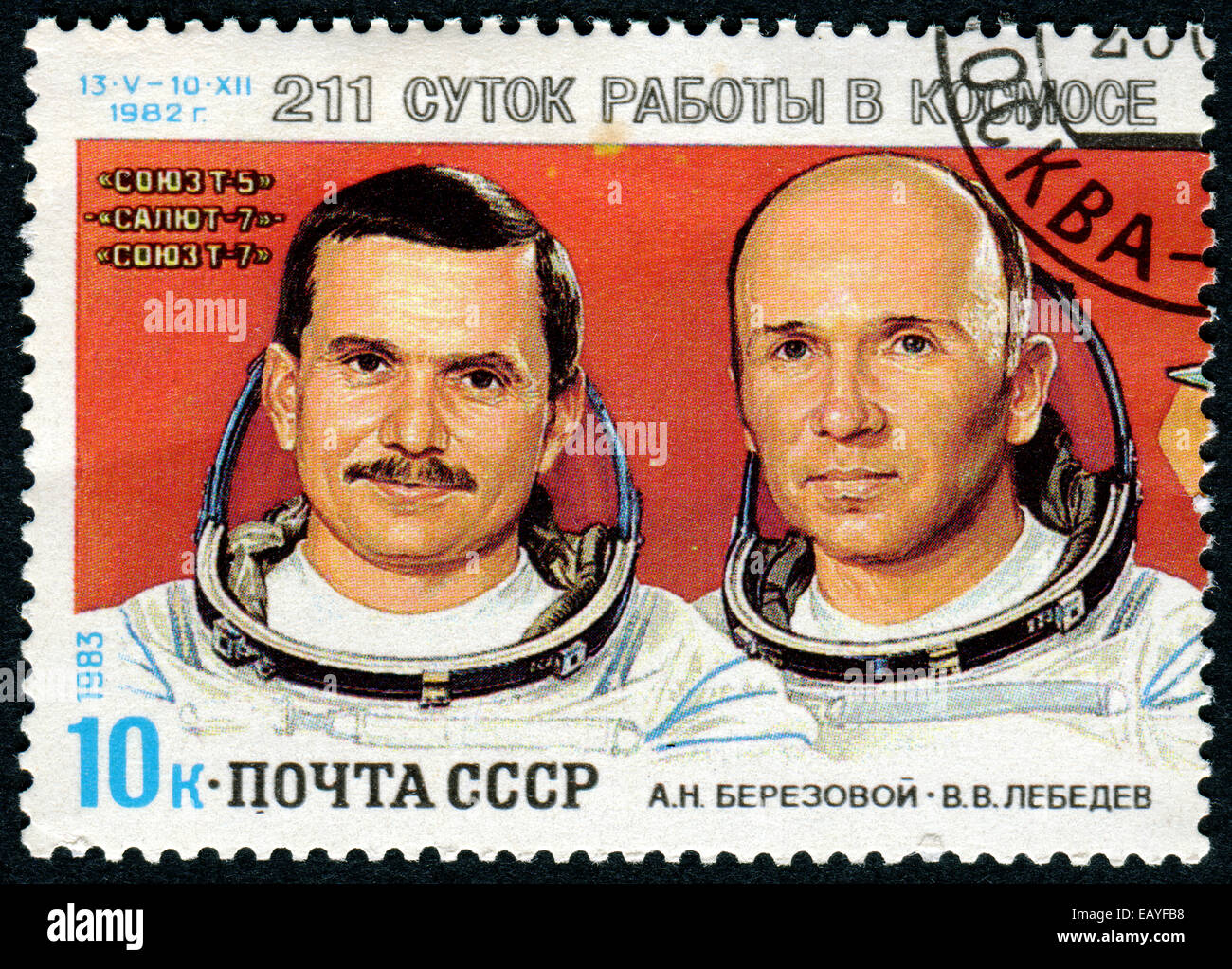 USSR - CIRCA 1983: stamp printed in USSR, shows Spacecraft Salyut-7 and Soyuz-7, cosmonauts A. Berezovoy, V. Lebedev, 211-day Stock Photo - Alamy