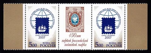 2007. Всемирная выставка почтовых марок «Санкт-Петербург – 2007». 150 лет первой Российской почтовой марке. 5 р. Сцепка с купоном.