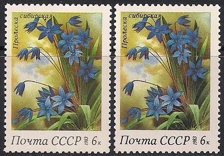 СССР 1983 год. Цветок "Пролеска сибирская" (ном. 6к). Разновидность - разный цвет