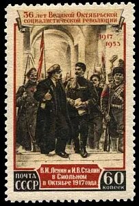 1957. 87 лет со дня рождения В.И. Ленина. "В.И. Ленин с красногвардейцами в Смольном". 40 к.