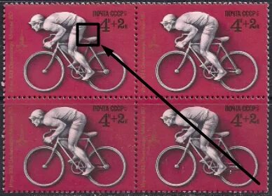 СССР 1977 год. Олимпиада в Москве. Велоспорт (ном. 4к+2к). Квартблок. Разновидность - красный цвет заходит на велосипед