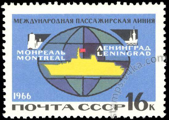 Купить марки 1966 Морской транспорт СССР. Международная линия Ленинград - Монреаль. Силуэт теплохода на фоне земного шара