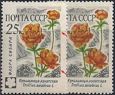 СССР 1960 год. Купальница азиатская (2411). Разновидность - сдвиг рисунка, светлый цвет, фон на марке слева