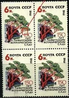 СССР 1962 год. 150 лет Никитскому ботаническому саду. Земляничник (2658). Квартблок. Разновидность - красная точка над "150" (Ю)