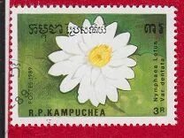 Марка Кампучия 1989 год. Нимфея Египетская Кувшинка Nymphaea dentata. Водное растение.