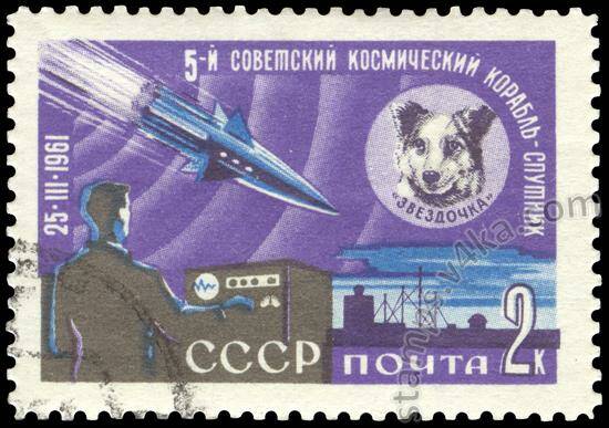 Пятый советский космический корабль - спутник, собака Звездочка, почтовая марка, СССР 1961 г.