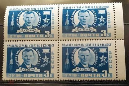 Марки СССР 1961 г. Ю. А. Гагарин, первый человек в космосе, квартблок с полем, сохран на фото