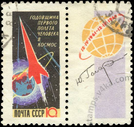Дёшево. СССР.1962.2674.Годовщина полёта Ю.А.Гагарина. 10 к. Купон-сиреневый. Поле слева.