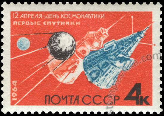 12 апреля - День космонавтики. Первые спутники. Почтовая марка СССР 1964 года. Стоковая иллюстрация № 5509918, иллюстратор Щегол