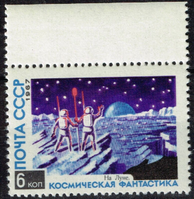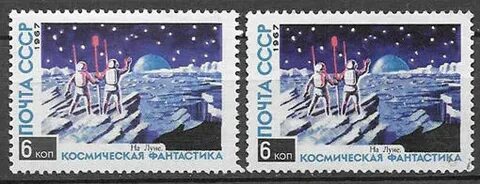 СССР 1967 год, Космическая фантастика, 2 марки, разновидность. В правой марке просвечивает текст "Восходит Земля"
